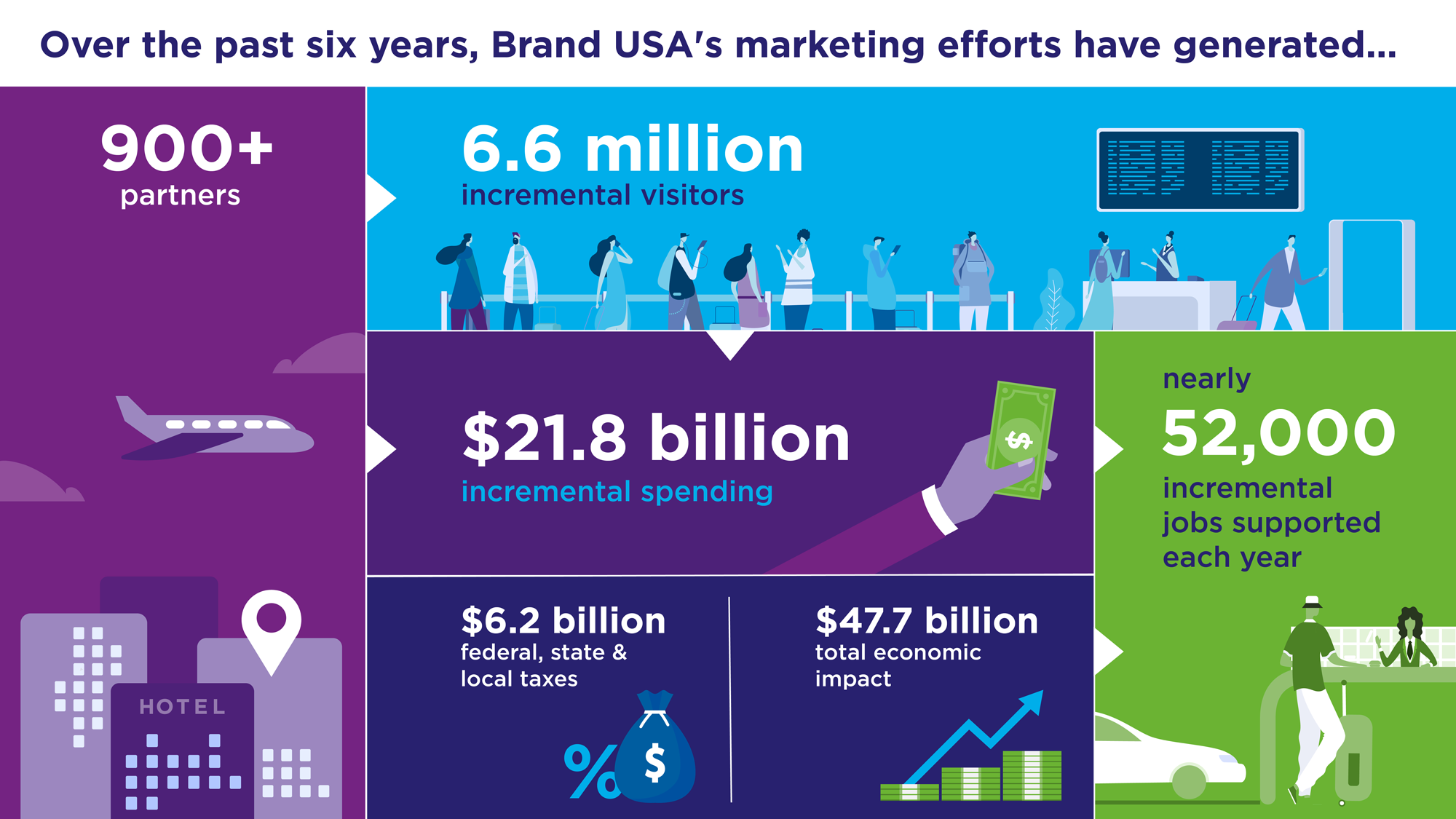 Since 2012 Brand USA, in collaboration with travel industry partners, has been responsible for attracting an additional 10.3 million visitors who spent nearly $35 billion in the United States, generating $76 billion in economic output, and sustaining nearly 40,000 jobs per year. Without any cost to taxpayers, these efforts have generated $10 billion in tax receipts and returned $20 to the U.S. economy for every dollar spent.